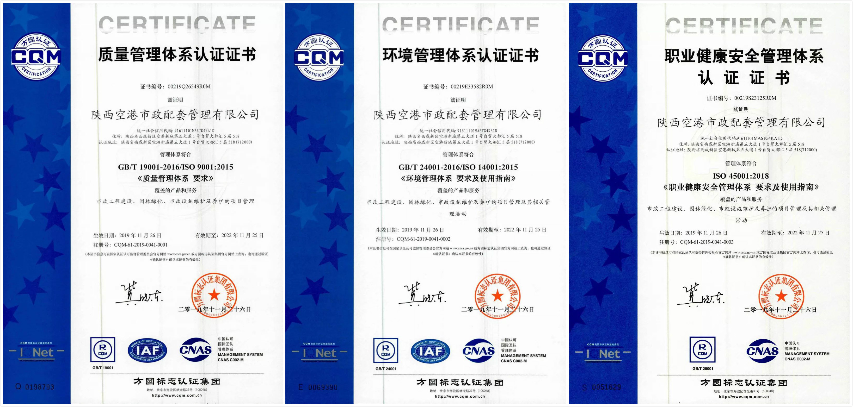 12月3日,空港市政公司顺利通过质量、安全、职业健康三体系管理认证,取得ISO9001(质量管理体系)、ISO14001(环境管理体系)及ISO45001(职业健康安全管理体系)体系认证证书。