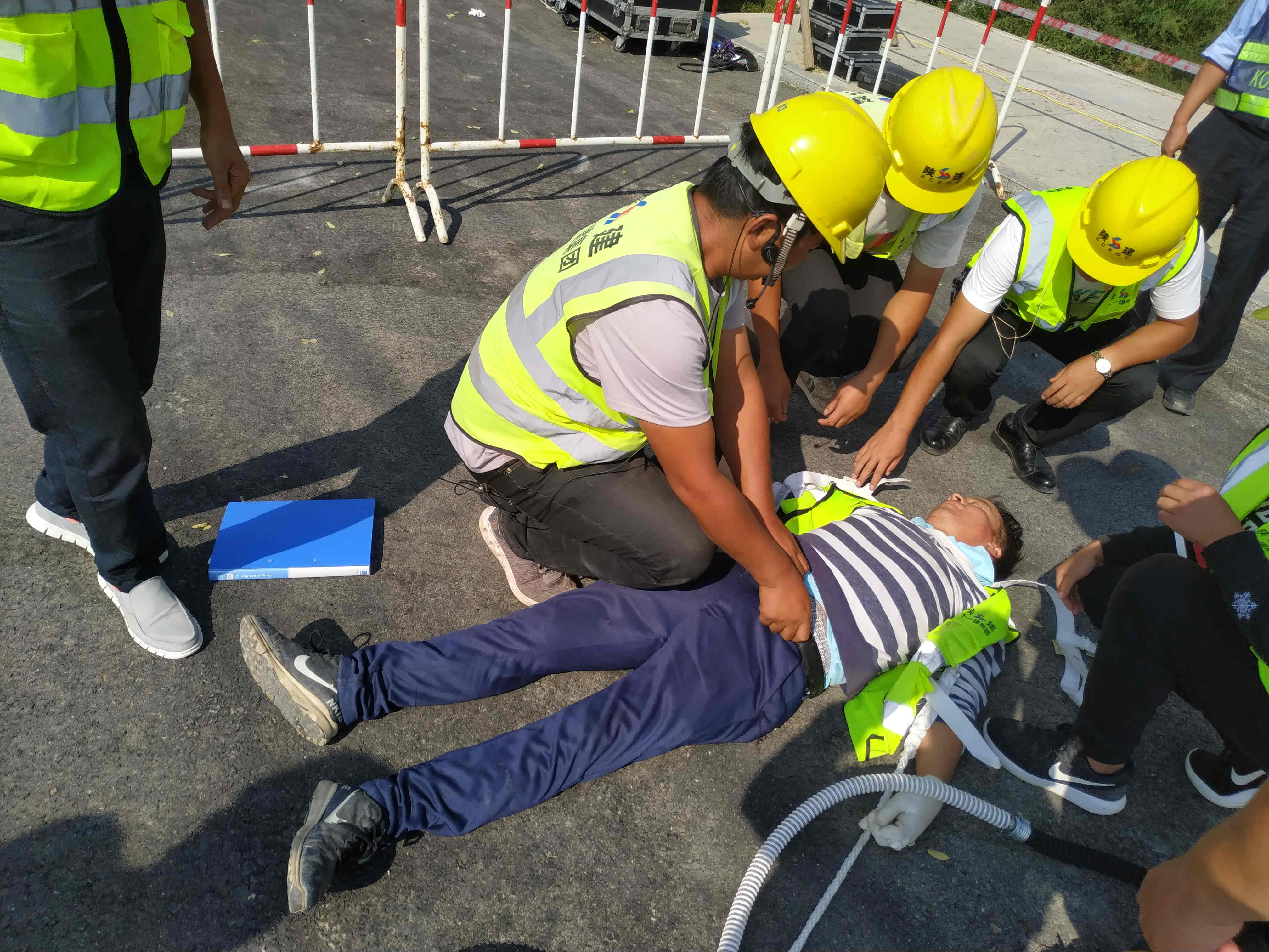 本次演练是假设空港新城崇仁路市政工程在进行井下“管道堵头拆除”作业时, 井下作业人员的呼吸面罩输气管因杂物冲击磨损导致漏气和堵塞,造成缺氧发生窒息事故。