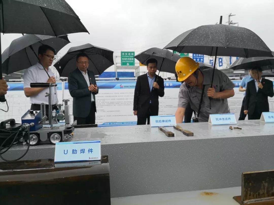 在朱宏路(北二环-绕城高速)快速化改造工程现场,工程总承包单位陕西华山路桥集团有限公司相关负责人就智慧化工地管理进行了详细介绍,操作演示了行为追踪系统、司机行为监测系统、扬尘监测系统、智慧工地APP、智慧劳务管理系统、市政VR安全体验、GIS+BIM施工管理平台、实景模拟互动体验等内容;介绍了工程施工中采用的钢箱梁焊接工艺、超高阻尼隔震橡胶支座、多向变位梳齿式伸缩装置等先进技术。