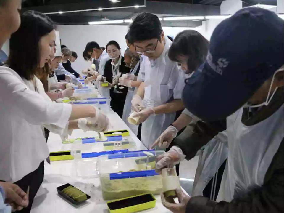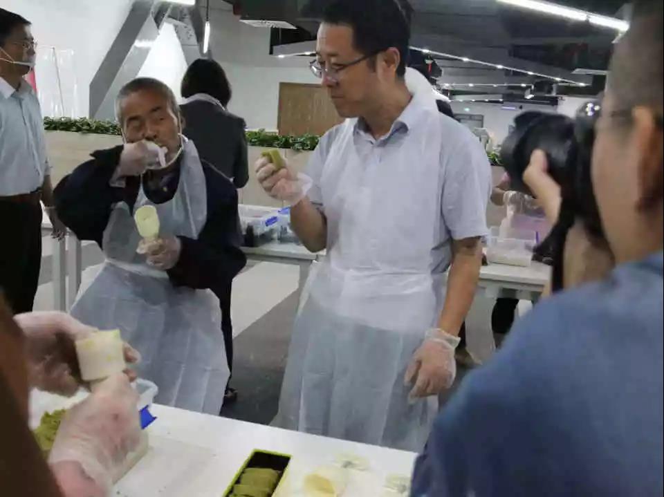 活动刚开始,大家立刻被桌上的粽叶、糯米、红枣、绿豆粉吸引了,专业糕点师看到眼里,心领神会,立即请工作人员给大家戴上手套、穿上工作服,一边示范操作、一边讲解动作要领,指导大家来一次技能大比拼。
