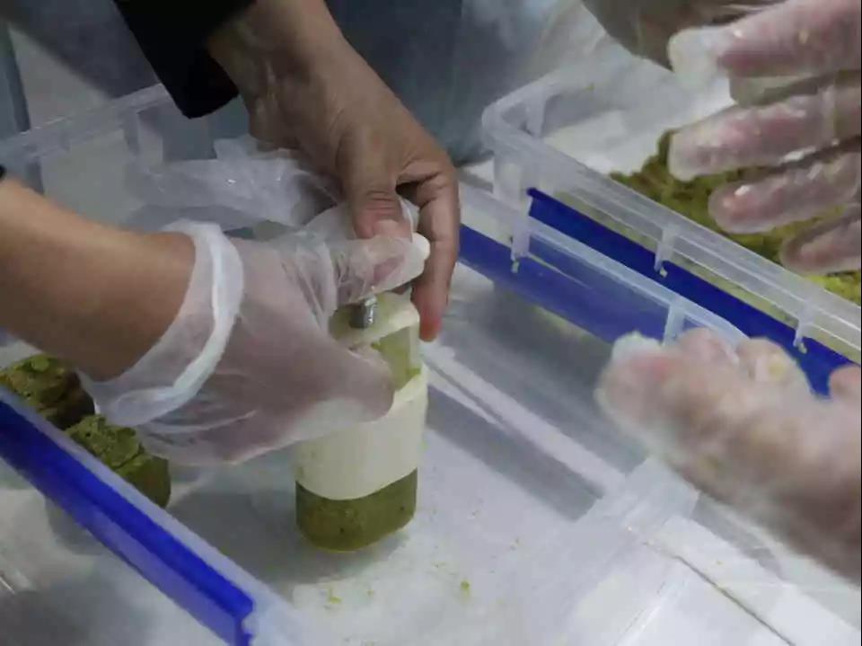 粽子包好啦,糕点师傅又安排大家安装模具、醒粉、揉面、压制绿豆糕。大雁塔、树叶、祥云纹……各种造型的绿豆糕一个个在自己手中成型,大家不禁高高举起绿豆糕凝视,左看右看,连声惊呼:“好神奇啊!真是我自己做的?”