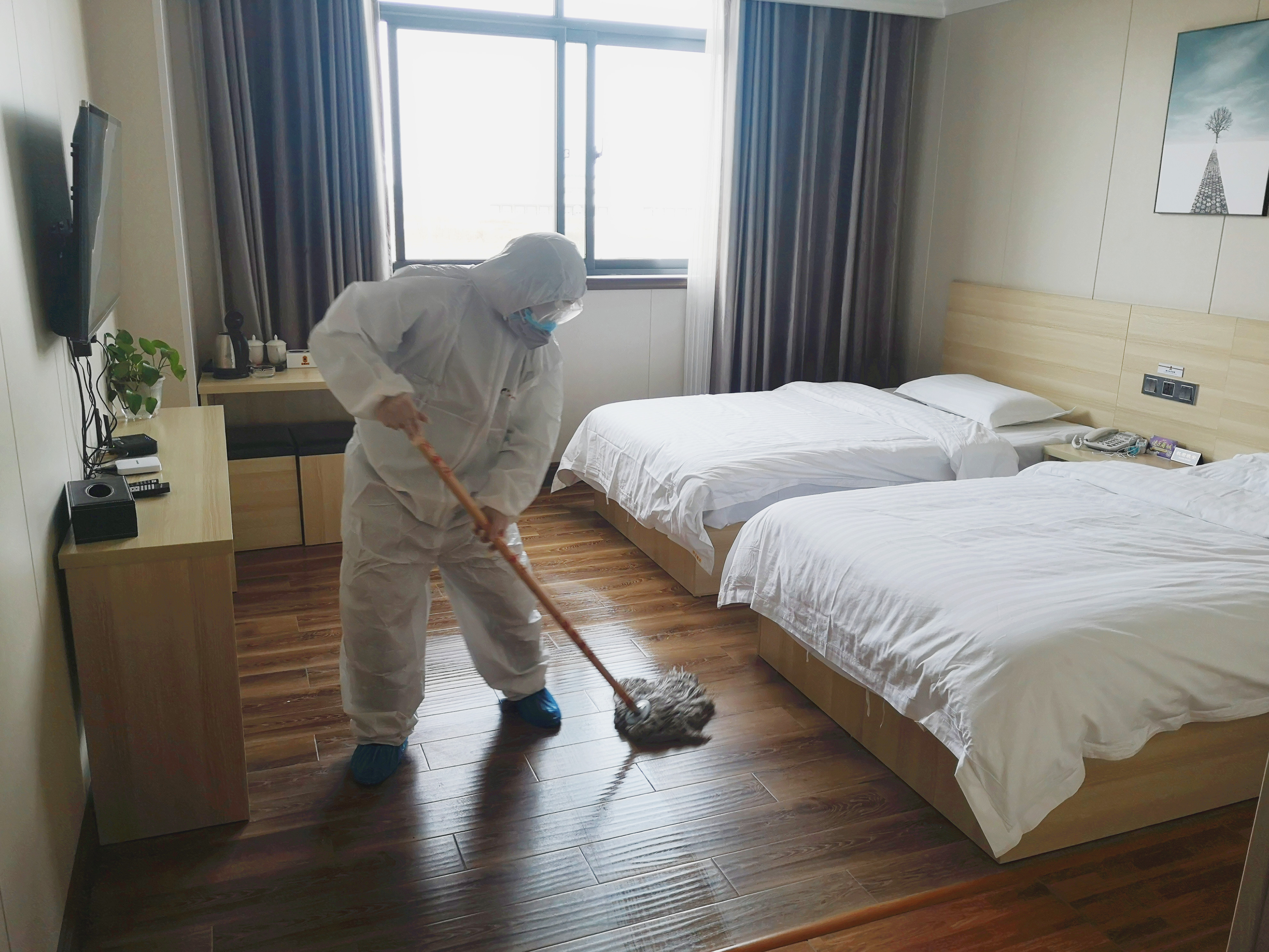 “清理住宿服务点房间,说没有心理压力,那不可能。” 队员李醉菊说,“但是看到汗水浸湿了队友们的衣服和头发,雾气模糊了护目镜,大家喘着粗气抚平每一张床单、清理每一个死角。我被战友无私奉献、勇敢担当的精神感染了,也就不觉得有压力和辛苦了。”此时已经是晚上10点半,经过近3个小时的奋战,李醉菊和其他11名队友刚刚完成16间留观客房的布草更换和卫生清理工作。