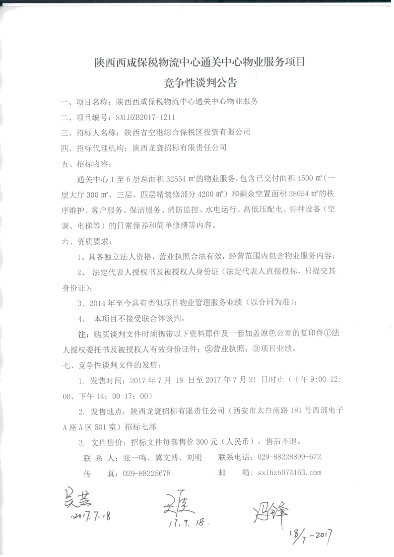 陕西西咸保税物流中心通关中心物业服务项目竞争性谈判公告