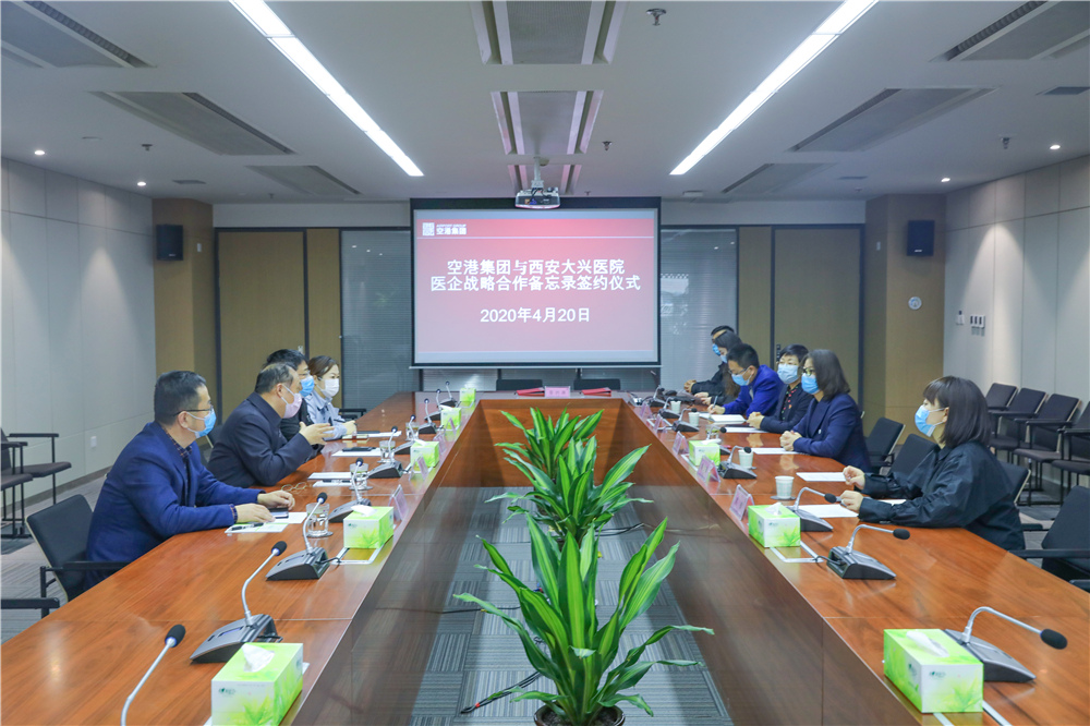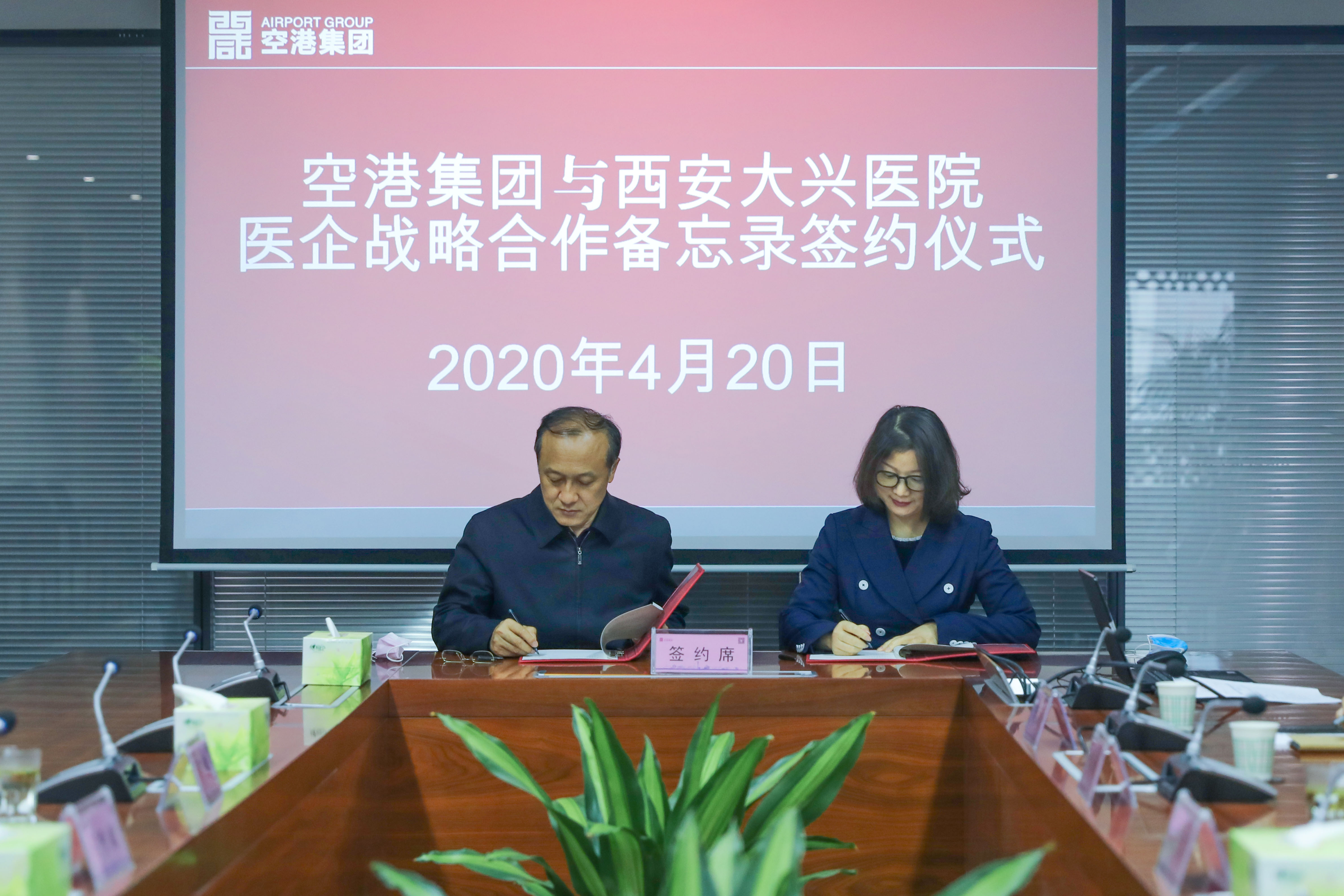 4月20日,空港集团与西安大兴医院签署医企战略合作备忘录,并就各板块合作事宜进行商讨,西安大兴医院党委书记、董事长李振斌,院长贺建军,副院长李振贤,空港集团党委副书记、副总经理邵元锦参加签约仪式。